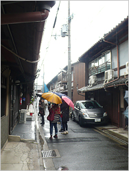あいにくの雨の中でしたが、情報センター会員・友の会会員・その他と、多くの方にご参加いただきました。実際に探されている方、町家をお持ちで参考にと物件を見に来られた方、それぞれおられました。今回の物件は、織屋建ての町家や平屋のものも含め、比較的すぐにでも入居可能な物件が多かったように思います。見学途中にあった「三上路地」や作事組改修の「ギャラリー・うさぎ」さんにも寄り、お施主さんに快く中の説明もしていただくことができました。