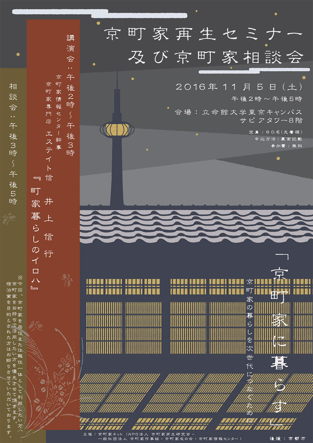| 講演会 | 午後2時〜午後3時 京町家情報センター幹事 京町家専門店 エステイト信 井上信行 『町家暮らしのイロハ』 |