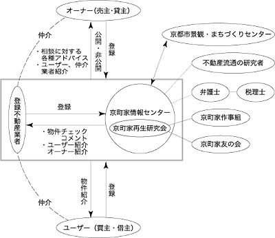 京町家流通の活性化を目指して 以前から京町家再生研究会の事務所などに、京町家の不動産情報に関する問い合わせがあり、京町家の保全・再生を考える上で不動産流通の問題は避けて通れないものとなっていました。一方、不動産業者の出す物件広告でも、以前は「古家付土地」としか表されなかった京町家物件が、昨今の京町家ブームでにわかに脚光を浴び、最近では盛んに「京町家」とか「町家風」とかの言葉が使われ、どれが本当に町家なのか混乱している状況です。 そんな中、不動産流通の研究としてスタートした「不動産情報企画委員会」が中心となって、平成13年10月の例会で財団法人京都市景観・まちづくりセンターと共催して行った不動産流通のシンポジウムでも、京町家の不動産流通に関する窓口の必要性の強いことが再認識され、今回「京町家情報センター」の設立に至りました。 ![]() 「京町家情報センター」(代表:松井 薫 事務局:住まいの工房 衣棚通三条下る西側)は、京町家再生研究会と当センターに登録した不動産業者により構成され、さまざまな京町家に関する不動産流通の情報を集める役割をします。当センター設立の主旨に賛同し、共にセンターの活動をしていこうという不動産業者が当センターに登録し、自社で取り扱っている京町家の物件をセンターに提出します。提出された物件は、再生研の担当者により調査され、その町家の歴史的、文化的な位置付けや改修にあたっての処方箋をコメントして、その不動産業者に返します。と同時にセンター登録物件としてセンター内で公開し、登録不動産業者はコメント付の物件案内を見ることができます。 一方、京町家の持ち主からは、不動産業者に相談する段階ではないが、いろいろと京町家の専門家に聞いて見たいとの要求に対する窓口として相談をお聞きします。センターには京町家再生研究会のメンバーはもちろん、その主旨に賛同した登録不動産業者や、京町家作事組、京町家友の会、弁護士、税理士、不動産流通の研究者をはじめ、京都市景観・まちづくりセンターとも緊密なパートナーシップを組んでいますので、持ち主の相談内容に応じて、次の一歩を踏み出す際のアドバイスをすることが出来ます。それが京町家を売りたい、貸したいという形になった時は、再生研の担当と登録不動産業者の担当により、物件として調査し、コメントを付けてセンターに物件登録いたします(登録は無料)。また、京町家を買いたい、借りたい方については、個別にお話をお伺いし、京町家の保全・再生のための当センターの主旨を理解していただいた上で、ユーザー登録をしていただきます(有料2,000円/年)。それぞれの方の希望場所、金額、使途に応じて適切な物件があれば、登録不動産業者が提示し、ご案内いたします。また仲介が成立した場合も、登録不動産業者が仲介業務を行います。その際、仲介京町家の補修、再生に要する費用の概算等の相談も、京町家作事組が引き受けます。当センターに登録していただいた方を対象に、京町家に関する勉強会や、京町家の再生事例の見学会等も今後随時行っていきたいと思っております。 今回のセンターの活動は、これからの市民社会のあり方を考えるうえで、市民運動と民間の業務の新しいコラボレーションとして画期的な取組みといえるでしょう。そしてさらに京都市の行政的支援を得て、市民・業界・官の協働を実践していきます。 このような内容で「京町家情報センター」が平成14年4月に設立されました。この試みが京町家の歴史的、文化的価値を再認識し、これからの生活を考える上での原点として、現存する京町家が保全・再生され、有効に活用される一助になることを願っています。 ユーザー登録について 京町家情報センターは物件情報を下記サイトにて掲載しております。 物件を検討中の方は下記サイトからユーザー登録をお願い致します。現在は無料で下記ページからご登録いただけます。 「京町家情報センター 物件情報」 随時更新中です!