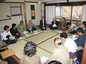 第2回全国町家再生交流会の2日目、午後からは5つの分科会でさまざまな問題について議論・情報の交換がされた。第4分科会は、上七軒のお茶屋の建物を活用した会場で、空き町家と利活用を希望する人との橋渡しをする活動に焦点をあてて話し合われた。 話し合いに先立って、大井代表の挨拶があり、会場となっているお茶屋の建物について、井上えり子さん(京都女子大学准教授)から解説があった。その後、各地での具体的な活動についての報告があった。