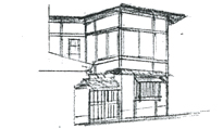 2階外壁にかわいいタイルが張られた4軒の長屋が並ぶ中の1軒。外構にも緑が植えられていてかわいらしい雰囲気の町家。これから若者がここで町家生活を始める。丁寧に住んでいき、町家生活を存分に楽しんでほしい。(2011.6) |