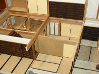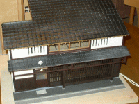 その建物は、終戦直前まで確かにあった。烏丸御池を少し西に入った南側、両替町の角から2軒目のところに、確かにあった。ベンガラ塗りの出格子、大戸の上の屋号の入った街灯、2階の虫籠窓、夜には格子から中の明かりが漏れて道路にシルエットを描いていた。今はなくなってしまった、自分の生まれ育った町家を模型で復元してほしいと、訪ねてこられた。材料は1枚の「青写真」とセピア色の古い写真、それと本人の記憶。時間と出来の保証はできないが・・・といいながら「作ってみましょう」とお受けしてしまった。内玄関を入ったところに大きな陶器の鉢があり、金魚が泳いでいた。塀は木賊貼で横の壁は錆聚楽、走り庭にはおくどさんと流しがあって、井戸もあった、1階の座敷には宣徳の火鉢があり雪見障子越しに庭が見えた・・・断片的な記憶を繋ぎ合わせて・・・