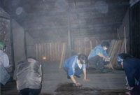 | おそうじ隊出現 3月末の桜にはまだ少し早い頃、堀川今出川近くのとある町家で、時ならぬ大掃除が始まった。通り庭の上、吹き抜けの火袋の壁のホコリを払い、梁の上に長年積もったホコリも拭き掃除をする。2階ではタタミを上げて、床板を隅から隅までていねいに拭いていく。