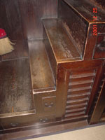 開き戸や引き戸による戸棚を仕込んだ階段。移動可能な家具であるが大工が作る。