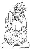 中国の故事に倣い、家に振りかかる邪気を打ち払う魔除けとして下屋の上に置かれる、鍾馗をかたどった小振りの瓦人形。