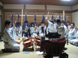 はじめ15世紀に建立されたとされる大舩鉾は、四条町(新町通四条下る)にあって、後祭のしんがりを務めていました。その姿は、舳先に2メートルもの大金弊(現存)を掲げた優美なものだったとされていますが、残念なことに1864年(元冶元年)に起こった禁門の変により、木組みや車輪を焼失してしまいました。その後は、残ったご神面や織物をはじめとする懸装品を展示して居祭を続けてきましたが、町内の住人の減少、高齢化により、1995年には、その居祭も中止となりました。しかし、町内から祭が消えていくことを惜しむ声が上り、1996年秋より、町内の有志が中心となり、同じ新町通にある岩戸山囃子方の指導を受け、祇園囃子を復活させました。7月13日から16日にかけ、かって大船鉾のあった四条町にてお囃子を行っていますが、昨年は懸装品の展示をすることができました。