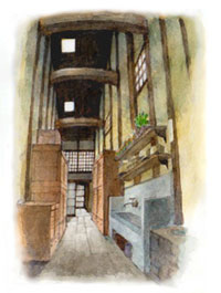 松井 さっき見せていただいて、まず思ったのは、先生がおっしゃったように高い木がビュッ立っている。そのものやないですか、これね。高い木が立っていて、上の方に寝る場所があったり、風が吹いたりして木が実はこういう揺れ方をするんですね。これを利用しているんですよ、町家の場合も。難しく言うと曲げモーメント、というのですけれどもね。曲げに対して応力を利用しているというところがものすごく特徴なんですね。今、造ってもいいといわれている木造は軸力という、この(縦の)方向の力しか認めていない。曲げに対してはゼロなんですけれども、この時代はそれと同じくらいの力がある曲げという力も皆使い切ろうとしていたみたいなところがありまして、下から上までずぼっと一本の高い木を使ってます。そして裏側に細い貫(ぬき)という材料がはいっているんですけれども、それによって、風が吹いたり、場合によっては地震で揺れたり、ということがあるんですけれども、そのときに曲げのしなりでもたそうという考え方があるので、まず構造的にそうやなと思った。それから、あの絵を見たらまったく天空からここも明かりが降りてくるんですよね。ジャングルも同じですよね。