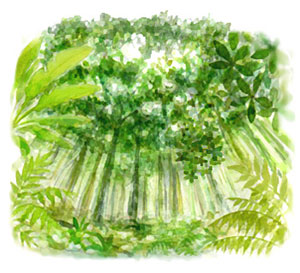 山極 今もですか。実はジャングルの木というのはほとんど根がない。何故根がないかと言えば、雨がすごく降る。根を地面にずっと下ろしていても、養分が雨によって流されてしまうので、地表近くでそういった養分を吸収するような根にしとかなければならない。根はもちろんありますけれども、ほとんど木を支える役に立ってない。さっき言ったみたいにジャングルの木というのは、上の方で枝と葉っぱで互いにからみあって支えている。何かの拍子で風がすごくたくさん吹いて一本の木が倒れると、共倒れになってすごく大きな穴がボーンとあく。私はそれが中庭みたいだと思っている。町家は必ず走り庭と家の真ん中に小さな庭がありますよね。そこに日光がこうサーッとさすんです。驚いたことに風が上の方からスーッとはいってくる。またスーッとぬけていく。こういう垂直の方向の風がそこに生じる。これも、ジャングルではギャップというんですけれどもね。樹冠に穴があいて、太陽に光がさして、そこは全く別世界。ジャングルの動物たちは普段は暗いところに暮らしているから、そういう光の輝くところに行くとみんなでゆったりして昼寝をしたくなる。そういう場所なんです。私はこれはいわゆるジャングルの中庭だなと思う。