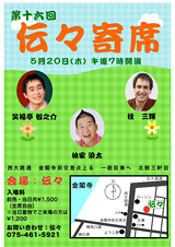 ![]() 時間:19:00〜 場所:伝々 北区衣笠御所ノ内町29(西大路通金閣寺交差点上る一筋目東へ北側3軒目) TEL:075-461-5921 料金:¥1,500 当日着物でご来場の方は、¥1,200 お申込不要 終了いたしました。