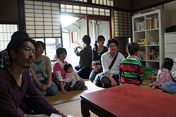 山本英雄(京都市上京区) 楽町楽家は第3回から見学者としてオープンハウスを主体にいろいろな町家を見学しお話をお伺いしてまいりましたが、今回「京町家友の会」様からのお声がけもあり、オープンハウスとして参加させていただきました。今までは何かのかたちで参加したいとは思っておりましたが、イベント会場には狭すぎるし、建築当時のまま残されている町家と違って、住みよい様に改修しているので、オープンハウスで参加するのはおこがましいと思っておりました。今回は「住まいとしての町家」ということでしたので、思い切って参加いたしました。当日までは、こんな家でいいのだろうか?町家のイメージを壊さないだろうか?といろいろ心配しておりましたが、多くの方に見学いただき、「楽町楽家」の旗を降ろす余裕も無く1時間延長になりました。5月26日は約50人、6月3日は約20人の方に来ていただきました。学生の方は建築の勉強、中年の方は主に町家生活をする為の見学、高齢の方は懐かしさでの見学が多く、お話をしていると「実際に住んで居られる町家が見たかった」と多くの方がおっしゃられて、大変楽しいイベントとなりました。あるご夫婦のお話ですが、ご主人が町家に住みたいと思っておられるのですが、奥様がなかなか賛成されないので、実際の町家暮らしを見てみようと見学にこられました。奥様のお考えが変わったかどうかは判りませんが、一人でも多くの理解者が増え、一軒でも多くの町家が残るお手伝いが出来たことに感謝いたしております。 私は若い頃、町家のことは何も知らず、木造の離れを壊して洋風の白い家を建ててしまいました。このことからも、いかに若い方々に向けて、町家の素晴らしさ、伝統の美しさを京都人として発信していけるか、私も微力ながら考える必要があると思っております。 今回、CHOBO様のような若いグループが「楽町楽家」を運営してくださったことは、大変うれしく素晴らしい事だと思っております。来年も楽しい「楽町楽家」を期待しております。 浜谷冨美子(京都市中京区) 7年前に縁あって中京の町家に住み始めました。(「京町家通信vol. 61 京町家再生の試み」に掲載)お千度、地蔵盆、運動会等、町内が集まる機会が多い京都の生活にようやく慣れてきたところです。楽町楽家は毎年の春の楽しみの一つです。今年のテーマが「住まいとしての町家を体感する」と聞いて、我が家にもできるかもしれないと、ときめきを感じました。また「町家暮らしを楽しむ人と人が繋がる」という企画者のイメージにとても共感し、お向かいさんをお誘いして、オープンハウスへの参加という一歩を踏み出すことになりました。 この楽町楽家の雰囲気がより広がればと、町内に回覧板でお知らせしたところ、他にも協力いただける家もでてきて、新しい町内のイベントが増えたかのように感じました。 果たして普通の家を見るために、どれくらいの方が来てくださるか不安でしたが、ふたを開けてみると、来客は途切れることなく、家中すべて公開していた我が家では、ろくに昼食もとれないありさま。それでも多くの方々とお話しするのは貴重な体験でした。 「私も町家暮らしなんだけど…」とおっしゃる方や、町内外のご近所の方が予想を超えてたくさん来られ、特に、以前この家に住んでおられた方の来訪はうれしい出来事でした。昔の家の様子、町内にあった路地の話などをお聞きして、時間の繋がりまでも感じることができました。 日常あたりまえに住んでいる家ですが、訪れた方に説明する中で「私って、この家のこんな所が好きだったんだ!」と気づかされたり、伺うお話の中から新たな魅力を発見したり。 これらの体験は、一緒にオープンハウスに参加したご近所さんも一緒のようでした。終わった後の目のキラキラが物語っていましたから。「来年はお宅もご一緒に」とご近所を勧誘する姿もありました。 楽町楽家は、町家で人と人とが繋がることによって、この家に、この町内に、言葉では表せない何かを置いて行ってくれたような気がします。ありがとうございました。 田中ひとみ(京都市下京区) 田中家の楽町楽家への参加は4回目ですが、これまでは作事組との共催でした。私たち夫婦が中心のオープンハウスは今回が初めて。そこで、普段からお付き合いのある藤津紫さん(ガーデンデザイナー)とご友人の由上恒美さん(陶芸家)に協力を得ました。「にわあそび・うつわそだて」というテーマで、お庭に花で虹を描き、空をイメージした陶器作品などをあちこちに展示しました。田中家には2歳の息子がいます。育児真っ只中の私たちにできるイベントとして「町家で子育てトーク」を企画しました。参加者は大人22名、2ヶ月の赤ちゃんから9歳までの子どもが9名。夜は寝室として使っているオクノマが人でいっぱいに。時計回りに自己紹介した後、我が家での日常生活や子どもが生まれてからの改修などについてお話しました。日照条件