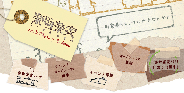 今回、「町家暮らし、はじめませんか」というテーマで楽町楽家2012の企画、運営スタッフをさせて頂きました。今までの楽町楽家の成果もあって、町家という言葉は好意的に広く知られるようになったと思うのですが、どうしても「特別な家」で、住まいとするには敷居が高いというイメージがあるようでした。かしこまった外観からでは表面的な町家の良さしか分からない、内部空間やそこに暮らす人々の豊かな生活を知ってもらえればもっと身近に魅力を感じてもらえるはず、との思いで、半年前からああでもないこうでもないと準備をしてきました。無事会期を終え、今は感謝の気持ちでいっぱいです。経験不足ゆえ至らない面や反省も多かった運営メンバーでしたが、その分皆様に助けて頂いた面が多く、ご参加、ご協力戴いた皆様と作り上げた楽町楽家であったと感じています。特にご参加頂いた皆様には沢山の方へのおもてなしに連日ご協力をいただき、本当にありがとうございました。