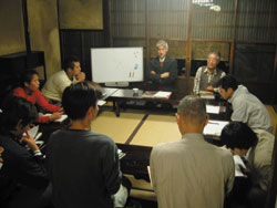 今さら、棟梁塾なんてという疑問をもたれるかも知れない。堂宮や数寄屋で活躍し、棟梁と呼ばれる職人は現にいるじゃないかと反論されるかも知れない。しかしわれわれが考えている棟梁とは、明治初めに来日して、大森貝塚の発見者としても知られるモースが絶賛した建築職人のことである。彼はアメリカ中探しても見つからない優秀な職人が、日本中のどこにでもいて、地域固有の建築を作っていることに驚嘆しているが、さらに職人が伝統の技を上手にこなすだけでなく、未知の課題にも果敢に挑戦して、し遂げてしまうことに驚いている。彼らが飛鳥時代に寺院を、戦国時代にセミナリオを、明治に擬洋風建築を建てた職人であり、京町家棟梁塾が目指す棟梁である。 塾では技は教えない。技は現場で自ら修得すればよく、現場は作事組が用意する。また技だけでなく何も教えない。なぜなら教えられたことは応用が利かない。自らが知りたい、覚えたいと思うことを、求めて掴んでこそ自分なりに整理された知識になり、覚えたことが体に組織される。塾はそのきっかけになる場を用意するだけである。いや、場づくりも塾生が自主的に運営する組織を作って決めていくように要請している。また、“だれが生徒か先生か”のメダカの学校にしようと言っている。学ぶ者だけで教える者がいなければ自ずとそうなる。 具体的な塾課程は第一、第三木曜7時から座学として、『町家再生の技と知恵』をたたき台にして学ぶ。第二日曜に現場学習として、ひとつには作事組の改修現場で各職の親方に施工の要諦を学ぶ。ふたつには過去の優れた建築や庭を体験して学ぶ。みっつには茶や花などの建築に関連する分野を体験するといった内容である。 既に座学2回と現場学習1回とを済ました。現場学習はたまたま相談のあった町家が、蔵を含めて数棟ある大規模なもので、その実測調査をする必要があったため、急遽予定がなかった午前中に調査実習として実施した。施主(相談者)と話をしながら、職人と設計者がチームを組んで行う作業は、施主と職人がやりとりをしながらの住まいづくりの再生、職能を超えて協働するという意味からも、棟梁塾の目指すところである。また塾生同士が知り合うよい機会にもなった。仕事が終わってから座学に駆けつけてきて、塾が終わってからもハシリや通りで─近所迷惑の配慮が必要だが─午後10時になっても話をしている。 読者のみなさんにも住み手として、作り手として、あるいは趣味人として、メダカの学校に参加をお願いするかも知れませんが、その時はよろしくお願いします。またそれに関わらず京町家棟梁塾へのご支援ご協力をよろしくお願いします。 2005.1.1