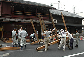 末川 協(再生研究会幹事) 祇園祭山鉾構造調査に参加して 昨年に引き続き、京町家再生研究会では祇園祭山鉾連合会、京都市、京都府の文化財保護課に協力し、祇園祭の山鉾調査を行った。今年はより規模を広げ、近年に改修を行った鉾などを除く8基の大型の山鉾の構造体の実測を行った。7月10日の四条通での蔵出しに始まり、13日の新町通での曳山の車輪取り付けまで、短期間の組立作業の合間を縫う調査には、京町家再生研究会の研究者、設計者に加え、建築士会会員からの応援、京町家作事組からの職方、京町家棟梁塾の塾生までが加わり、総勢30人を超す協力者が集まった。8つのご町内に日替わりメンバーで各チームが張り付き、各山鉾の仕口を含めた部材寸法から櫓や芯木の全体寸法までを記録し、ベテランの大工棟梁は使われる木材の材種をすべて確認して回った。組立作業への思わずの邪魔や失礼にお叱りを受けながら、時にそのお手伝いにも加わりながら、走り回る4日間であった。野帳のスケッチではパニックになりかけた若手大工も、櫓の組立の応援ではてったいさんに混じりながら足場の上でカケヤを叩き、面目躍如の様子であった。 華やかな懸装に覆われるそれぞれの山鉾の構造の調査は、今後も引き継がれていく山鉾の修繕のためでもあり、その資料化をお手伝いする意味がある。そして同時に、個人の経験の枠をはるかに超えた時間の中で完成されてきた山鉾の伝統的な構造の理解の試みは、その全体から細部までの技や知恵に学ぶことで、町家再生への取組みともつながる。