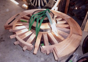 実測調査によって描写する設計図とは違って、外観から予想しがたい古車輪を解体してこそ見える各部材の形状、ホゾ、仕口等の継手の仕事、あるいは、それらの動きや遊び寸法等、制作に携わる職方の工夫を目の当たりにすると、町家のような伝統建築によく似通った生きた職人技と深い知恵がそこに充満している事に驚かされる。