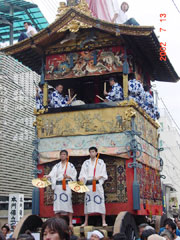 本日は、山鉾の曳き初めの日、祇園祭のメインイベントの始まりです。小雨のぱらつく中でしたが、迫力ある山が動くところを拝見いたしました。子どもたちも混じって綱を曳いていました。その後、事務局小島邸のお座敷にて夏のしつらえの拝見をし、お茶をいただきました。報告・知念靖広(02/07/13) ![]() |