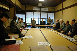 望月秀祐前会長からは、ご自身がたずさわられた京都市の建築指導行政、都市計画行政の変遷から今日の景観政策までの流れとその中での町家の位置づけ、近い将来訪れる鉄筋コンクリート造の建築物の耐用年数限界への警告をお伺いしました。 吉田孝次郎氏からは、京町家再生研究会の成果と裏腹に、京都市内の景観はこの10年間でも加速度的にもとの姿を失っていること、今日の町家再生で現状のストックをしっかりと生まれた姿に戻した上で、新しい都市住宅の姿もやはり必要になることを伺いました。自動車や近代設備を100%否定することは出来ず、されどもその流れに流されない町家の姿の模索には、同時代的な町家の再生タイプが最後に生まれた昭和初期以来の新たな取り組みが望まれているという見解です。町家の美しさと刺し違えながら暮らすことは道楽では出来ないと、御自身の生き様からの発言でした。 三村浩史氏からは昨年から動き始めた町家まちづくりファンドの報告、後継者の育成を見据えた中期的な戦略が京町家再生研の活動に必要であることが述べられました。 参加者を交え、京都の戦災とも言うべき強制疎開の歴史、町家に対する税制の課題、都心の自動車の問題、家族と家と言う関係の喪失、町家の定義の裾野を広げすぎることへの問題提起まで多様な意見交換が行われました。 |