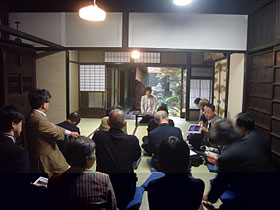 ■2007年総会報告 日時:平成19年5月12日(土) 場所:長江家 今年も五月の例会に先立ち、平成19年度の総会が開かれました。平成18年度事業報告及び収支決算書承認、平成19年度事業計画及び予算案承認、役員改選が行われました。 「京都市の新景観政策について」 日時:平成19年5月12日(土) 場所:長江家 5月の例会では、京都市副市長の毛利信二氏をお招きし、京都市の新景観政策について、今までの景観行政を振り返りながら、今年の9月から施行される条例の概要をお聞きしました。その具体的な内容だけにとどまらず、ご自身の京都への想い、条例制定に至る行政内での検討の経過や、業界団体との討議の経緯も率直に御伝え頂くことが出来ました。新しい建築物へ向かう新条例の効果だけではなく、町家そのものの保全再生へ向けた景観重要建造物指定や町家ファンドの運用の拡大、充実を目指す方向も語られました。議論を待ち望みながら政策の柔軟な運用を目指す姿勢、今後の京都都心部での自動車交通への取り組みの課題や展望についてもお伺いできました。再生研の参加者からは今後の官民のパートナーシップの課題、伝統構法の適法化と町家の再生産の展望についても意見が上がりました。