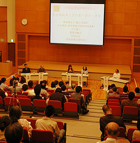 2007年6月例会報告 公開シンポジウム「新景観政策と京町家の保全・再生」 日時:平成19年6月9日(土) 場所:京都市景観・まちづくりセンター 6月例会では昨年に続き公開シンポジウムを行いました。はじめに「これからの景観まちづくりと町家再生」について国土交通省の岸田里佳子氏により、基調講演を頂き、楽しいことができるツールである景観法の概要、景観重要建造物の指定による町家再生の状況と課題、日本各地での景観法の運用状況、新しい景観形成のための事業制度の動向などについてお話を頂きました。景観行政や町家の再生について京都市でのご自身の経験も印象深く語られました。京町家再生研の木下龍一氏からは再生研の発足以降の活動の歩みと今日の公的援助が入るまでの町家再生の流れ、その中でやはり現実的な課題となっている建築基準法による既存不適格の問題が語られました。同じく野間美輪子氏からは実際の改修のハードルだけで無く、町家の活用を広げる点でも、特殊建築物への用途変更や、営業許認可の課題が実情に合わず、その一方で問題ある安易な改修が増えていること、この点で総合的で根本的な代替案が、町家再生を広げるために必要である状況が語られました。司会を務める宗田好史氏からは人々の関心が京町家へ先走りする中で、変わり行く歴史的街区の中で町家と人の暮らしのつながりを再構築する再生研の課題が述べられ、大谷孝彦理事長からは、京町家・まちづくりファンドの運用状況と町家の歴史的、文化的評価をさらに広めていく必要が語られました。 最後に岸田氏より、本来、規制で行うものではないまちづくりや町家の保全再生を、プロ集団を自覚する人々が規制に会わない部分でいかに機動的にドラマチックに処理し、ふくらませて行くことができるのか、これからの再生研の活動への期待を語っていただきました。 |