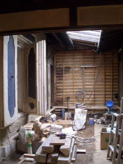 2007年11月例会報告 「町家改修現場 見学会」 日時:平成19年11月10日(土)14:00〜 場所:小島邸 京町家再生研究会の事務局、本部でもある小島邸の表屋の部分1,2階と玄関部分、中庭の復元改修工事の見学会。床や壁の表面の合板などが取り除かれて、以前の構造がよく見える状態になっている。中庭を覆っていた屋根が取り除かれると、とたんに風が通るようになったとのこと。覆っていたものをはがしてみて、想定される蔵の部分の前の床の元の形や、道路面の格子などの形状について、木下理事より説明があった。 |
