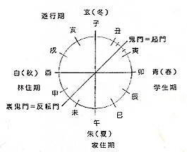 一方人間の成長過程は十二支でたとえられる入れ子構造の輪で説明されます。「子」の時間から始まる1日があり、青春、朱夏、白秋、玄冬であらわされる1年があります。人間の一生は鬼門(起門)からスタートして、青春の学生期、朱夏の家住期を経て、裏鬼門(反転門)に至ります。通常、厄年といわれる