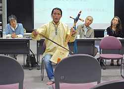情報センター事務局の松井薫氏は楽町楽家の実行委員でもあり、演奏者でもあります。音楽にとって町家が魅力的な理由として、楽器の多くが木で作られ ており、町家と共鳴することをあげられました。もう一つの魅力として倍音があり、人間の耳には届かない高音でも、実は体には作用しており、それによっ て非常に気持ちよくなるという考えもあるそうです。 馬頭琴、ホーミー奏者の岡林立哉氏はこのような倍音の魅力を実感させる生演奏を聞かせてくださいました。草原でも町家でもない空間でしたが、不思議 な音の響きを味わうことができました。岡林さんは近年京都に住むようになり、神社やお地蔵さんが身近にあるという京都の地域性が日常生活や子育てに よい影響を与えていると感じられているそうです。生活と文化のつながりを感じさせました。