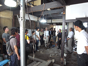 設計担当の木下理事より改修の経緯、プランなど説明があり、作事組棟梁塾第1期生で今回の改修を担当している大下氏より、工事の概要などが説明された。 壁に貼られていた合板をめくると、雨の影響で壁がほとんどなくなっていることを目の当たりにし、柱の沈下がいたるところに見られるなど、現時点でしかみられない現場を見学し、見えない場所の補修の大切さを実感した。 骨組みだけになった町家を実際に見学し、補修の考え方など、現場にかかわるメンバーの話を聞きながら、活発な意見交換の場となった。 |