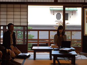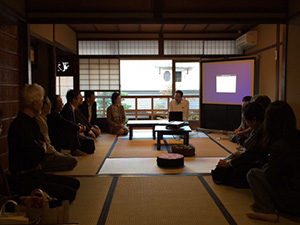 最初にオーナーの家永氏から改修に至ったいきさつをお話ししていただきました。ひょんなことから町家が手に入ったという家永さん、「直すのであれば本格的に直したい」ということで、作事組にゆだねられたそうです。アイスクリーム屋を開業したのはあとから検討したことで、「冷蔵庫を置くくらいだから、町家にさほど手を入れないで済むのではないか」というお考えだったとのこと。1階店舗も今回例会を開催した2階も畳の座敷がつながる町家らしい空間です。「きゅうくつな形で体験してもらうのも町家の良さを感じられてよいのではないか」という言葉が印象に残りました。