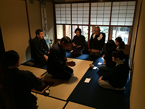 1月例会報告 初釜を楽しむ 日時: 平成27年1月18日(日) 場所: 釜座町町家 ![]() 初釜の様子 釜座町の町家に炉を切って、お茶のお稽古やお茶会などしてみてはどうかと言い出したのは自分だっただけに、このお稽古、なんとしてもやり遂げねば、という思いはあるのですが、日常生活とは違う所作、動作に戸惑いやら抵抗やら、いろいろ複雑な思いが湧いてくるのを抑えつつ、格闘している状態であります。 さて、一月十八日日曜日、朝十時集合ということで、少し前に町家に行ってみたところ、まだメンバーは誰も来ておらず、松井師匠と森さんだけ、落ち着いた風をして話をするが、内心は落ち着かず、そこへコートに袴の大下さん登場、「その姿、プレッシャーやで」と以前正装をして私たちの初めての茶会に来られた客のことを思い出す。あの時も、鐘(建水)が鳴るやら、泡が立たないやら、揚句に「お道具拝見」やら、あれ以来、トラウマになってしまい、「大下さん殺生やで」と逆恨み。そうこうするうちに茶道部の仲間勢揃いし、森村氏が「金鳳宿龍巣」と書いた掛け軸を取り出した。正月にふさわしい、めでたい軸らしい。「金の鳳凰は龍の巣に宿る 藪内流六代 比老斎(江戸中期)」であります。「花器は青銅龍耳花入 松花堂好 秦蔵六造り」「蓋置 突羽根蓋置 高木治郎兵衛作」「風炉先屏風 名物裂屏風」「花はみやこどりという椿」でございます。と覚えて変わり番に話すことになっているがスラスラ出てくるはずもない。ここで釜座町茶道部のメンバーを紹介させて頂きます。只今6人、一際熱心な井上さん、道具や美術に強い森村さん、真面目で慎重な吉田さんと六十の手習いの私の釜座町4人組、そこに初めから極まっている三木さんと新入の森さんの作事組女性2人。お稽古の時は楽しく、和やかそのもので、正座もそこそこ、冗談、失敗飛び交う楽しいひと時なんですが、今日はそういう訳にはいきません。 いよいよ十一時になり、初釜開始。初めからそんなにお客さんは来ないと踏んだ私は一番バッターを選んで、待機。一番に入ってこられたのは、当町の釜師、高木治郎兵衛さんの奥様と町家のお隣さん、そこに袴姿の大下さんと朝日新聞の記者。もうあきまへん。茶室の扉を開けるところから、すでに位置が違う、入って水差しをおいて、茶碗と棗、最後に柄杓と建水を持って、扉の前で一回りするのを忘れて一直線で正座、鏡柄杓して、蓋を取り、棗、茶杓を清めたまでは出来たように思ったが、次が出てこず、ストップ、お正客に次のことを教えてもらい、茶筅通し、やっとのことで、お茶をたてるもなかなか泡立たず、途中から、半頭が、掛け軸やらの説明をはじめ、そちらの方に皆の気が移ったのは良いが、なかなか終わらず、二服目が勧められない事態発生。「お茶が冷める」と言ってやっと二人を終えたところで、点出しのお茶が出てきて「おしまい」に突入。しびれを堪えて茶器を片付け、扉のところで、総礼。ああしんど。次はちゃんとやらねば。と思いつつ他のメンバーがどうかは、扉の内で分らない。皆なんとかやり遂げたみたい。上の階では松井師匠が、本邦初のコーヒー点前を披露、二階に上がった人は皆楽しげに降りてくる。昼休みに私たちも体験。豆煎り、豆挽き、煮出しと作法めいたお点前に皆、納得、円の真ん中にコーヒー豆を張り付けた色紙もユーモアたっぷり、意味ありげで和やかな気分になる。昼が済んだところで、再登板、今度は、最初よりはましな出来にホッと一安心。町内の子供も来てくれて釜座町のお客は全部で十一名。皆それぞれに安堵の表情。また次回? 少しは上達しているかな。 結びに、今さらながらやっぱりお茶は奥が深い、楽しく飲めばよいと言いつつも、知識と教養が必要。季節に対する花やお菓子、軸と花器、茶碗の形、茶釜に屏風、茶人と歴史、道具、和歌、短歌、俳句、漢詩等々、知れば知るほど日本文化が凝縮していることへの驚きと釜座町という居場所に殊更感慨を持った一日でした。 |