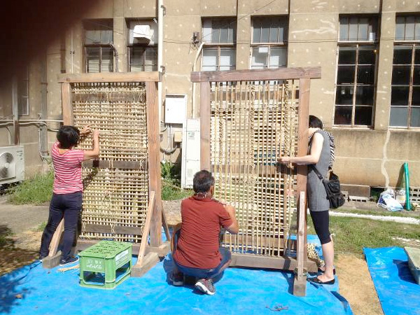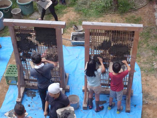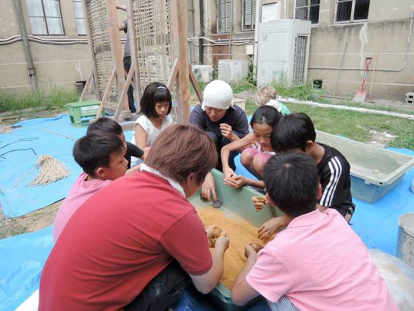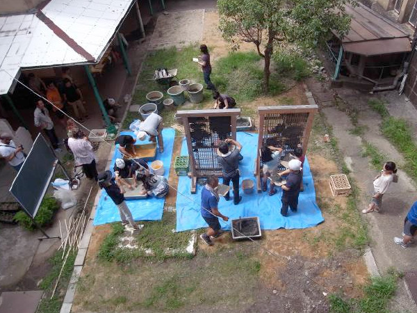 子供達の為の土壁塗ワークショップ ![]() 竹小舞を編む ![]() ワークショップ全景 ![]() 土を塗りつける ![]() 泥団子をつくる このワークショップに突然飛び入りされた、大阪の工芸高校の先生と、わざわざインターネットでこのイベント情報を知り、関東から参加された2人の女性小学校教師は、土壁ワークショップを体験して、再び地元で再現したいと考え、指導者達の話しを良く聞き、慣れない作業に熱心に取り組まれていたのが印象的だった。おそらく東京では珍しい京都東山の土と西山の竹という、地域の自然素材を用いた京町家の土壁塗ワークショップは、貴重な機会になった様である。 一方子供達は、土壁塗仕事の合間に、左官親方が持参した色付き泥団子に興味を抱き、作り方を教えてもらうや、この団子作りに集中し始めた。練り土を手に取り丸めてゆくと段々小球体が出来上がる。まんまるになるには、一生懸命丸めねばならないが、子供達は男女を問わず父母までもが熱中する。出来上がると乾いた土玉を水に浸し、自分の好きな赤や黄、じゅらくや青の色土にまぶして手のひらで磨き上げる。数十分の作業だが、これ程仕事に熱中する子供達は最近なかなか見られない。最後に、親方から持って帰ってもいいよと言われた時の喜び様は、この上ないものだった。 私達、再生研、作事組メンバーの間では、常々京都市内の小学生を対象にこうした町家の作り方の基本的技術、大工、左官、瓦師達の仕事を紹介する機会を、是非作って行きたいと考えてきた。市内に大量に存続する京町家の構法、作法に於ける職人達の素晴らしい伝統技は、私達の住み続ける都市の生活環境の中に、大事な遺産として再生産され続ける価値あるものとして、世代を越えて伝えてゆきたいものである。 WAC-8 は、京都での会議や「アートと考古学展」その他関連イベントを通じて、私達に京都の地中に埋蔵されている遺物群と、それらから学ぶ歴史、文化の大切さを教えると共に、現代社会の抱える問題として、考古遺物や過去の生活文化を捉えなおし、将来の展望に向けて次の世代の人々と共に、新しい価値を共有してゆく必要があることを明示してくれた。WAC-8 京都実行委員会の反省会に参加して、世界の参加者からのレポートや市民、観光客のアンケートの内容がとても好評だったらしく、「アートと考古学展」や、そこに参加した私達の京町家再生活動への注目、関心がより高まる事を期待したい。 ところで、本年4月にオープンする四条町大船鉾町会所改修工事現場に於いても、地域の子供達を集めて、町家の土壁塗りワークショップがもよおされ、町内の皆様に喜んで頂いた様である。 将来、市の小学校の教育プログラムの一環に、京町家再生の技と知恵を学ぶ時間を、是非採用していただきたいものである。 <木下 龍一(京町家作事組 代表理事)>