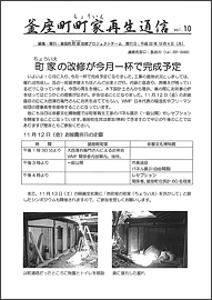 事業の進捗や会合の内容を町内の住民全員に報告し理解を得るため「釜座町町家再生通信」が発行されました。改修工事が始まってからは、紙面の半分(裏面)は、工事を受け持つ京町家作事組が担当し、工事の進捗の報告や「木舞掻き・荒壁塗り」「三和土づくり」体験会へのお誘いや結果の報告、各種見学会の報告などが掲載されました。