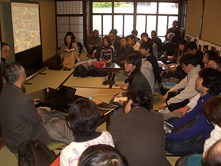 新しく始める京町家塾は、範囲を広げ、A、B、Cの3コースと特別講義の4つのメニューとした。Aコースは、町家の歴史・地理的広がり・町家単体の意匠・構造・町家の生活の特性など町家に関する知識を深めてもらうコース。Bコースは自分たちでできる範囲は改修したい人たちの要望に答えて、木工技術・べんがら塗り・木舞掻き・荒壁・三和土・障子紙張りなどを実際にやってみるコース。このAコースとBコースを交代に月1回のペースでそれぞれ6回行うことで1年間のスケジュールとしている。Cコースは、町家の生活に即した文化(茶道とか年中行事とか)や歴史(町内の古文書の解読など)に関するもの、特別講義はそれぞれの専門の先生方による専門分野の話を、適宜、塾として取り組んでいくことにしている。 幸い、Aコース、Bコースの塾生の募集をしたところ、募集から2週間ほどで、今年1年分の予定していた人数が埋まってしまい、これを見ても、多くの人がこういう機会を待っていたことがわかる。 何故、今、寺子屋形式の町家「塾」なのか。それは人と人のコミュニケーションの基本である、顔をあわせての対話でしか伝わらないものが多くあること。1年を通して何度も釜座町町家に足を運んでもらうことになるが、季節による温度変化、光の変化などその場の環境も含めて五感を活かしながら聞くことが、話の内容を理解するのに役立つこと。何よりも、町家の話を町家の中で聞くことにより、実感を伴った理解が得られること。そして、その中で町家の生活の楽しさを、参加者それぞれが発見してもらいやすいこと、である。現代生活の中では情報を得るための手段は、本や雑誌・新聞・テレビ・インターネットに接続されたパソコンと飛躍的に増え、得られる情報量も膨大なものになっている。一方、人間の情報処理能力は、印刷が発明された時点でピークをむかえ、現在に至るまでほとんど変わらず、1MB程度だといわれている。結局、多くの情報があっても、それを処理し、加工して、身体に取り込む量は限られており、要するに安易に得られた情報は、簡単に忘れ去られるということだ。その点、対面形式の少人数での塾は、選ばれた情報を、短時間で質疑応答なども通じて加工処理でき、五感を通じて身体化できる点で、非常にすぐれた方法なので、この一見古臭い塾という形式を選んだ。 第1回目は、この京町家塾の塾長でもある、花園大学教授高橋康夫先生の、町家の歴史の特別講座だった。予定していた定員をはるかに超える33名が出席して、釜座町町家の2階で縁側や中の間にも人があふれる状態での講義となったが、参加者も大変熱心に話を聞き、質疑応答も次々と質疑があり、高橋先生に一つ一つ丁寧にお答えいただき、終了時間をかなりオーバーしてしまった。終わったあとも先生の机を数人が取り囲んで、いろいろと質問し、話を聞くという状態だった。この京町家塾を実施することによる効果は、以下の3つの段階が考えられる。先ずはこの1年で今回参加希望の塾生たちが町家に対する知識を身につけ、技能を習得することだが、今後も町家に興味や関心をもった多くの人たちが、この塾に参加し、町家に対する理解を深めることで、次の世代へ町家が継承されていくこと。これが第一段階である。ただ、塾形式の弱点は、一度に多くの人を塾生として迎え入れることができない点であるが、1年間しっかり受講した塾生たちが、今度は自分たちが、自分の言葉で町家の良さを伝え始めることで波及していく効果があると思っている。また先日の新年の作事組お披露目の席でも、町内の方々から、月に一度はお茶会をしよう、という声もあがっていたようなので、京町家塾Cコースとしてそのような取り組みも行えると、町(ちょう)家(いえ)としての役割や、地域との交流の場としても、少しでもお役にたつことになり、よみがえった京町家塾の意味も更に大きなものになる。これが第二段階である。この段階になれば、地域との連帯の中で、町家の存在意義が広く知ってもらえるようになり、地域の中で埋もれている、使われなくなった町家が意識されるようになってくる。それらをこんどは積極的に新しく活用する手立てが、地域の問題として考えられるようになる。町家の活用を希望する人とうまくつながれば、町家の新たな住み手も加わることになり、地域の活性化にもつながるだろう。更に、第三段階として、これからの社会を担っていく、小学生、中学生たちにも、町家の知識や生活の体験学習の場として、教育プログラムが京町家塾で作られるようになると、京都の小学生や中学生は、少なくとも1度は京町家の勉強をし、生活の一端を体験することになり、京町家という側面から自分たちの住んでいる地域の特性を知ることにつながるわけで、教育効果としても大きなものが期待できるし、何よりも次の世代が町家に対しての理解を持つことにより、年間1000軒近く壊されている京町家の実態の