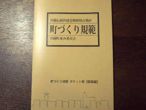 町づくり規範小冊子 昭和58年(1983年)に設立された市民団体「川越蔵の会」は、この問題に対し、「自己の商業力なくして、歴史的建築物の維持はあり得ない。現代の店舗展開に歴史的建築物を最大限利用しなければ、町並み保存は成り立たない。」という実践的テーマと、伝統的家屋における住環境の向上をめざして立ちあがった。この若手商店主や専門家、川越ファンの研究者達と行政、更に関係自治会の代表者達が加わって、「町並み委員会」を組織し、昭和63年(1988年)には、町並みの個店改装に伴うルールとして、市民にとってわかり易い「まちづくり規範」を策定した。全67項目からなる規範は、都市の形成から建物の配置計画、居住及び商環境の提言、町並み形成のデザイン要素等が都市から建築にまたがり、パターン化して表現したもので、いわゆる行為の規制ではなく、住民自らが考え合意した目標であり、「今後実践の中で鍛え修正し、真に自分達の言葉として身につけて行く」事が記されている。他方、こうした中で行政が行ったものは、「歴史的地区環境整備街路事業」による、都市計画道路「中央通り線」の一番街部分の拡幅を計画変更し、菓子屋横丁等の歩行者ネットワークの整備と、景観条例の整備をする事であった。それから平成11年(1999年)、旧川越城下町十ヵ町会や一番街商店街の要請を受けて、歴史的中心部を国は伝統的建造物群保存地区に選定した。川越の町並み保存運動の強さは、この地元商店街を中心とする市民が、周辺の自治会や専門家研究者達と共に市民団体を立ち上げ、行政とタイアップして、粘り強く商業活性化による街並み保存を実現したところにある。この活動は更に地域を拡げて、大正浪漫夢通りや昭和の商店街、周辺住宅地へと拡がっている。歴史的建造物は商店や銀行、郵便局、レストランだけでなく、近代の町家や民家として、市のあちこちに存続している。昨年条例化した景観計画が、歴史の積層する現代都市の形態を総合的に美しく再形成する為の有効策になるためには、市民の意識がそこに結集し、行動に立ちあがる事が何よりも大事な事である。