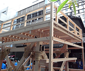 ![]() 占出山 2014年の山建て 1.復元新調とは 祇園祭山鉾連合会を通じて、各山の保存会の要請に応じ、京都府及び京都市の文化財保護課が緊急度と予算にあわせて復元新調を計画する。補助金事業となるため、専門家として京町家再生研究会が設計監理を担当し、図面と報告書を作成する。 山本体とは、駆体である櫓をさし、付随する床および胴掛け下地も含めている。巡行ではご神体や縣装品が飾られ、覆い尽くされるので、ほとんど見えない。祇園祭を基礎から支えている部分である。近世から近代にかけて製作された山の部材は保存会の方々や作事方が丁寧に扱われてきたものの、さすがに傷みが激しく、近年ようやく新調工事を迎えた。 計画のめどが立つと前年度から実測調査に入る。実物を調査できるのは一年に一度、お祭の期間、山建ての機会しかない。保存会、作事方ともタイトなスケジュールの中で動いておられるなか、ご協力をお願いしている。 基本的には割れや欠損部分を復元して元の形に戻すが、町家の再生と同じく、お町内の要望や工務店の意見も聞きながら、工夫できるところは改修を加える。構造は町家に比べるとシンプルだが、細かい部材も多く、特にご神体などがのる床の穴の位置、補強のための金物の実測や図面化には案外と手間と時間がかかる。 2.例会報告 櫓の構造は鉾と大きく変わるものではない。部材の大きさや筋違、貫の入れ方などは各山で異なる。櫓の構造は四方転びが一般的だが、四本柱が直立している山もある。床は当然のことながらご神体や飾りによって穴の開け方もさまざまで、松の位置も必ずしも中心ではない。鉾のように真木がある山もある。これらの受け材の工夫も多様であり、先人の知恵が見受けられる。胴掛け下地の造りもさまざまで、その違いが傷み方に出ているかもしれない。丈夫で長持ちする構造を検討する担当者にとっても得るところが大きく、各担当者同士が議論する場面もあった。 3.設計監理の役割 検討会と仮組 復元新調において共通しているのは木構造を第一と考え、不具合の調整は他の部材でおこなうということだ。金物も使うが、構造を傷めないように、材が長持ちするように考える。ところが、この一点が保存会の要望と噛み合わないことが多い。しかも保存会が抱えている問題の多くは実はこの点に関連しているようだ。保存会としては町内で受け継いできたご神体や縣装品が最も大切であり、無事巡行を果たすことが最大の目的である。巡行当日、効率的に間違いなく山飾りを進めるために工夫したい。各町内の作事方はその要請に従い、作業効率を優先する。急場しのぎに部材をはつったり、部品をとりつけたりして本体をいじめてしまうこともある。 このような問題は復元新調の過程において数回開かれる検討会で噴出する。検討会には各保存会、工務店だけではなく、京都府、京都市、連合会の担当者が参加し、実物や図面をみながら復元新調のあり方を確認する。設計や工務店としてはいろいろな提案をするが、基本思想が共有されていないと議論が噛み合わない。これらをすべて調整するのが設計監理として再生研に託されている。 縣装品との兼ね合いは象徴的な問題である。胴掛け下地の中には左右で寸法が違うとか、きちんとした直角部分が一面もないとかいう山もあった。検討会の中では仮組も行い、縣装品を実際につけて議論した。いつもはあわただしく行っているが、時間を掛けてゆっくりやってみるとできることもある。過去の写真を見ながら「謎」が解けたところもある。ある山では大きな下地仮模型を作り、織物商も来て縣装品の寸法を合わせる場面もあった。検討会や仮組は山全体を理解し、関係者が情報を共有できるという点できわめて貴重な機会なのである。 4.今後の課題 伝統の祭礼と技術をどのように伝えていけばよいのだろう。現代の技術や工夫も必要だが、木造になじまないものは避けなければならない。確かに技術は進んでいるが、新しい素材との兼ね合いは難しい。また効率を第一にすると、ものの扱いがおそろかになる。保存会や作事方でも一年に一度の短い時間で多様なことを伝えるのは難しいだろう。 今後は検討会や仮組のようなワークショップを開催し、関係者とともにじっくり取り組む機会をもちたい。縣装品の新調など、それぞれの専門家はいるが、総合的に検討するためには、設計監理の立場が重要となる。山に飾られた時、巡行時の影響を関係者全員で考える機会が必要であろう。 基本的な考え、すなわち駆体、構造が第一であるという意識を祭に携わるすべての方々に認識していただけるよう、まずは再生研が持っている情報を公開し、関係者と議論する場を設けたいと考えている。 9月例会 祇園祭の舁山新調 ―山鉾設計監理の課題― 平成27年9月12日(土)14時から17時 釜座町町家にて 占出山/木下龍一、役行者山/内田康博、山伏山/末川恊、 芦刈山/井澤弘隆、鯉山/三木佑美 2015.1