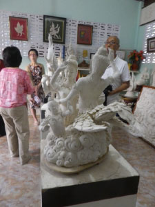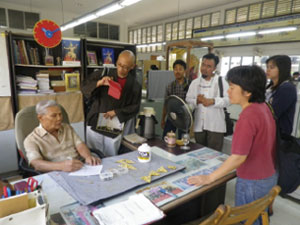 ![]() バンサイ国立民芸センター ![]() 美術工芸国際センターのポップな展示 ![]() スワンサムプラン美術文化協会との交流会 初日、まずアユタヤ県のバンサイ国立民芸センターを訪ねた。女王の肝いりで国中の30種の民芸を集め、実演、展示を行う。15歳以上の若者は手当て付で技術研修を行える。石鹸の彫刻やアートフラワー、ミニチュアのジオラマ制作等、今日的な分野もあるが、圧倒的に伝統民芸が面白い。200年前にタイにも普及したラーマナヤの踊りの被り物や仮面の制作では、木材や漆、にべ(魚の内臓の膠)や昆虫の羽根等、伝統的な材料とシリコンやセメント、アクリル塗料等、今日的な材料を取り混ぜ、30人近くの研修生が制作を行っていた。見学を傍目に、初め苦虫を噛み潰していた先生も大西氏の屈託のない質問に、蘭や竹を基にした伝統模様の原則からその象徴性まで、お話が止まらない様子であった。伝統絵画では漆や金箔で仏教作品を制作、優秀な卒業生はお寺の装飾や、外国人用のお土産つくりの仕事に就く。徹底的な模写が研修の基本だが、トレースは絶対にさせず、細部から全体まで自分の技量として習得を目指す。午後からは美術工芸国際センターを訪ねた。東北部、北部、南部まで数十の少数民族の伝統民芸、王室に伝わる金細工の技術や様式を再生した作品、伝統的な織物の展示と合わせて、著名な現代作家の工芸品やデザインが展示されていた。山田長政記念館を訪ね、チャオプラヤ川のボートでアユタヤの遺跡を楽しみながら川魚の料理を頂いた。 2日目は仏教美術館を訪ねた。近年の高僧の肖像や仏教シーンのデジタルアートなど、世俗化した印象に映るが、国民の95%が上座部仏教徒のタイと日本の大乗仏教の信仰のリアリティーの違いが印象的だった。ついでナコンパソン県の陶芸家ポンラック氏のアトリエを訪ねた。1000年以上前からタイに伝わるセラドン焼を今も作り続ける(セラは石、ドンは緑の意)。昼食後、スワンサムプラン美術文化協会との交流会に出向いた。お固い意見交換会などなく、伝統音楽やアートフラワー、葦の細工など、近隣のおじさんやおばさんの同好会の様子、空き瓶の中で寄木細工やタバコの包装を組み立てる揚げ物屋台のおじさんもいた。手作りの郷土料理を車座で頂き、輪になってダンスを踊った。ここでも大西氏が気さくな人柄で人気者になっていた。 ![]() スタッコ作家のアトリエ ![]() 文化庁伝統美術工芸センター 最終日はナコンパソン県、文化庁の美術工芸センターに出向いた。10分野の展示の内、半分が伝統工芸、国立民芸センターとも役割が重なるが、こちらは文化財の修復作業を中心に行う。いずれも修復の箇所が分るように直すルールがあると言う。伝統絵画、スタッコの他、螺鈿、寄せ木細工、パーライトンペールワッドウという特殊な飾り布、金工細工もあった。大西氏が各分野の様々な材料を手にして(時には舐めて!)、熱心に聞き取っておられた。 上記の行程で視察を終えた。今後、大西氏の詳細な報告やアンチャン氏との協働の取組に期待したい。かつてなじみの首都のチャイナタウン、料理店やマッサージ屋が今も健在であった。しばし忘れていたタイの優しい人達と交流、 2016.7.1 |
