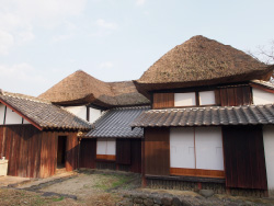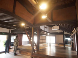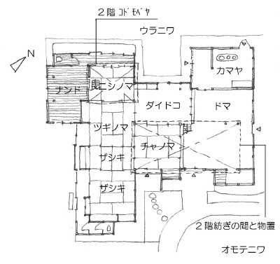 ![]() 旧乗田家住宅の表庭に植えられた柿の木 浜町は、佐賀県の南西部に位置し、多良岳山系の裾野に流れる浜川の河口に出来た町で、江戸時代には、長崎街道の脇街道となる多良海道の宿場町として栄えた場所です。この地区は、酒蔵、居蔵造町家が立ち並ぶ醸造町「浜中町八本木宿」と、浜川を渡って南岸にある茅葺町家と桟瓦葺町家が軒を連ねる在郷町「浜庄津町浜金屋町」とがあり、平成18年(2006年)に2地区同時に重要伝統的建造物群保存地区に選定されました。そのうち漆喰で軒裏まで塗り籠めた妻入りの町家が立ち並ぶ八本木宿の街道を水路に沿って遡り、路地を曲がって歩いていくと旧乗田家住宅があります。街道沿いの防火性能を高めた商家とは一転して、木造真壁2階建ての茅葺武家住宅が、生垣で囲まれた土地の中央に建っていました。この建物は、19世紀初期に建てられた推定されており、元は鹿島鍋島藩に仕えた旧武士、最所家(さいしょけ)の住まいであったそうです。その後、乗田家の所有となり、宿場町に残る数少ない武家屋敷の遺構として鹿島市の重要文化財として指定され、現在では浜のまちなみ保存のための運動をされている「肥前浜宿 水とまちなみの会」が所有し、文化塾などを開催して維持管理されています。 この建物修復は、民間の方々の尽力と、ある篤志家の寄付によって実現しました。平成16年(2004年)にこの場所を訪れた東京在住の方が、当時空き家になっていた乗田家を守ってこられた住民男性からの熱心な説明を聞き、感銘をうけ、物の修復費用として5500万円の寄付をされることになったそうです。それにより、この旧乗田家の改修計画が始まり、持ち主からの建物寄付、寄付金受け入れ母体として市民団体のNPO化が決まるという経緯だったそうです。 ![]() 平面図 見学した日にはちょうど、修復に当たってご尽力された上記住民男性と、町並みゼミ大会での鼎談登壇者である、元吉野ヶ里遺跡保存対策室長を勤められた高島忠平氏、嬉野からの大会参加者とが居合わせました。維持管理されている方は、この建物を訪れた方にはゆっくりと建物内で時間を過ごしてほしいとおっしゃいます。裏庭には草花も生え周囲の畑地もあり、兵農未分離が特徴であった在郷武士の生活状況を今に伝えているそうです。高島氏も鼎談の中で、文化財の活用についてお話しされました。吉野ヶ里遺跡も教育などの場面で今以上にもっと活用されるべきとの事でした。 旧乗田家住宅の表に育った柿の木にたくさんの実がなっている風景を眺めながら、昔は渋柿の木をそばに植え、柿渋をつくり防虫剤などに利用したとのお話を聞きました。建物や地域が保存対象になるだけではなく、この柿が住宅の傍らで実り続けるように、生活や生業も含めて継承し利活用され、その結果が風景として存続することの大切さを再認識しました。 ![]() 裏庭から見る ![]() 土間よりダイドコ(右手前)越しに見えるツギノマ(奥)とチャノマ(左中)シンプルな平面構成と、天井や屋根架構に変化があり面白い空間体験ができる 2015.1.1 |
