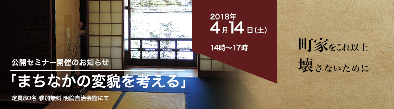 ![]() 公開セミナー開催のお知らせ まちなかの変貌を考える −町家をこれ以上壊さないために− お隣の町家が突然壊される、町内の路地に見知らぬ人が出入りするようになった、近隣に建設中のホテルがいくつもある、・・・近頃、まちなかの急激な変化により、地域の居住環境に不安を覚えることが多くなりました。京町家新条例(京都市京町家の保全及び継承に関する条例)や、民泊新法などにより、京町家がどうなるのか、どんどん住みにくくなるのではないか、とご心配の方々も多いようです。 そこで、京町家新条例が本来めざしていることを再確認し、京町家に関するさまざまな課題を整理するセミナーを開催します。当初からお伝えしているとおり、新条例が機能するためには、運用する仕組みづくりが必要です。「京町家をこれ以上壊さない」のは、所有者だけの問題ではありません。地域の居住環境に直結する問題です。地域の居住環境を良くする機会としてとらえ、民間でできること、そして地域でできることを一緒に考えていきましょう。京町家に関するみなさんのご質問に答え、これからの地域のまちづくりに協力していくメンバーがそろいます。お気軽にお越しください。 日 時 2018年4月14日(土) 14時〜17時 場 所 明倫自治会館(旧明倫幼稚園 遊戯室)京都市中京区室町通錦小路上がる 定 員 80名 参加無料