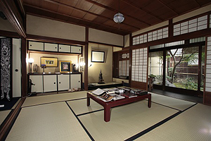 その後、伝統工法で改修され、どっしりした構えの〈船鉾町会所〉も見学。この町会所は、絞りを商う会社が、祇園祭り期間中のみ町内に明け渡す条件で賃貸契約され、上手く共存されていました。 ●小島家