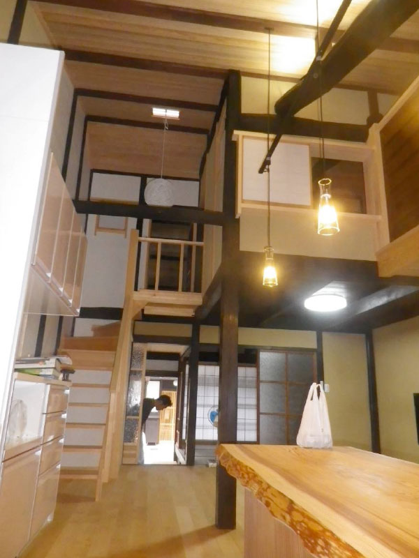 織屋建ての生家をセカンドハウスに--紫野 Fi邸設計:末川協建築設計事務所/施工:大下工務店 ![]() 改修後、猪熊通りの外観 ![]() 改修後、織場をLDKに 相談者に初めてお会いしたのは平成27年11月21日(土)、『「京町家を活かす」京町家の暮らしを次世代につなぐために』と題して立命館大学東京キャンパスに開催された相談会の会場でした。相談者は関東にお住いですが、京都の実家ではご両親が昔ながらの京町家におすまいとのこと。大きな改修はしないまま、現在のところは特に問題なく生活されていますが、今後、年齢が進むにつれて不自由が増えることが懸念され、本格的に不都合が生じる前に、住みやすく、今よりも暖かい家に改修しておきたいとのことでした。左右両隣の借家も所有されていますが、空き家となったままで、将来的にはその活用も考えたいとのことでした。立地条件は四条通りに近い街中で、売却すれば転居費用に不足はないようにも思われますが、ご両親は住み慣れた地でこれからも住まうことを希望され、相談者を含む子供たちご兄弟一同もご両親の希望を第一とされ、できれば生まれ育った町家群を維持し受け継いでいきたいとのご希望でした。 お住まいの町家を改修する場合にはいつものことですが、改修前に仮住まいに引っ越し、改修後に再度もとの家に引っ越すことになり、2度の引っ越しは体力的にも精神的にも大きな負担となります。今回は隣に所有される借家が空いていたため、そちらを改修して住まいとすることで引っ越しを1度で済ますこととしました。借家はすこし小さめですが、表借家と路地奥の借家を合わせると1階だけで生活することが可能となり、トンネル路地も家の一部に取り入れることで面積も有効活用できます。 表の家の築年は棟札によると明治36年6月でした。奥の家は不明ですが、そのしばらく後と思われます。土葺きのまま残されていた屋根瓦はすべて葺き替えました。大部分は当初のままの瓦と思われます。雨漏りの痕跡はあちこちにみられましたが、その都度補修され、現時点で漏れているとみられるところはありませんでした。但し、表の家は風呂・トイレ棟との取り合いの柱の傷みが激しく、それと接続する1階の桁にも蟻害が進んでいたため、柱、桁とも入れ替えました。また、奥の家も同じく風呂棟との取り合いの柱が傷み、鉄骨で補強してありましたが、柱を入れ替えることとしました。そのほか、揚げ前を通常通り行いました。当初から気になっていた柱の傾きについては、相談者も是非、できる限り直してほしいとのご希望でしたが、隣接する7階建てのビルの基礎コンクリートが床下まで侵入して柱の根元を圧迫し、反対側の屋根は現在のお住まいと接していたため動かせず、結果、ビルに接する柱を垂直に戻すことはできませんでした。それ以外の柱は足元を少し動かすことでほぼ垂直としています。 お引渡しはあと10日程に迫り、工事は最後の仕上げの段階となっています。今回の改修をきっかけとして、所有されるその他の町家群も今後有効に活用されるお手伝いをさせていただければと考えております。 内田 康博(京町家作事組)