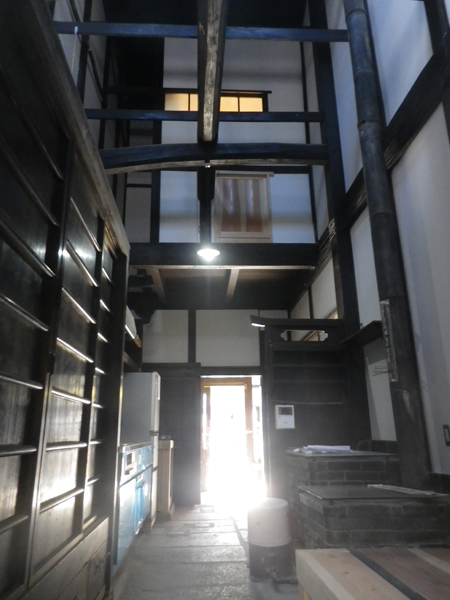 明治期の火袋8月初めに構造と外装の改修費用の概算提出。同時に京町家情報センターの協力を得て、賃料の想定。改修費用は10年を待たずに回収できる見込み。店子には宿泊施設の希望者が早々に名乗りを上げた。そして設計契約後、実施設計と内訳を作成した12月。お嬢さんから連絡があり、自己活用に変更したいと(都ハウジングさん済みません)。おっかけ内装設計、設備設計が追加された。元の町家への復元が原則であり、お嬢さんは新建材の耐用年数に根本的な疑問を持っておられた。元の本瓦が残されており、蔵の改修も工事に含めると決心された。 年を越し2017年2月に工事開始。急ぎの西隣の焼杉板の貼替のため、西側の揚げ前を先行。1階の座敷には2間一枚、間中幅の松の床板があり、揚げ前時には、それを活かして床柱をコボつ設計だった。根性を決めた大工が床下に潜り込んで8センチの揚げ前を成し遂げ、そのままの床の間を守った。施主であるお母様、お嬢さんには工事中の四条町会所の見学にも出向いて頂き、林理事長からも丁寧な応対頂き感謝する次第。また、亀岡のUh邸からも戦前の建具を支給頂き感謝する次第。想定外の工事では、同じ敷地内の別宅の土管のツマリと蔵の土壁の駄々傷み。蔵外壁の鉄板をはがすと四方の台輪が崩壊している状況だった。追加の工事費用もお嬢さんのこだわりにより即断即決。1階のお座敷の床下からは炉を切った跡と、掘り炬燵の跡が同時に現れ、それらの復元も追加工事に。炉壇は平楽寺書店さんのお座敷から支給頂き、重ねて感謝する次第。工期にも余裕を頂き、祇園祭までに主屋工事完了。奥の蔵と納屋の改修は時代祭までお時間を頂けた。 果たして10月に竣工引き渡し。三条通を見降ろす2階のオモテの格子を外し、時代祭の見物で、竣工お披露目のご案内を頂戴した。残念ながら昨年の時代祭は台風でキャンセル、1年後の秋の楽しみとなった。御引渡しから3か月、今年の初めには大宇陀のボランティアガイドさん達の町家見学を受け入れて頂いた。きっちり直った外観と、元の町家のまま改修した内観に、写真撮影の舞台としての問い合わせが続いているそう。この報告記事の出る前、2月にはお母様の作品展でギャラリーとしてのお披露目を企画されている。近年画廊の店仕舞いが続く三条東山で、歴史の詰まった町家のまま、真新しいギャラリーが賑わいますよう。 <末川 協(作事組設計担当理事)>