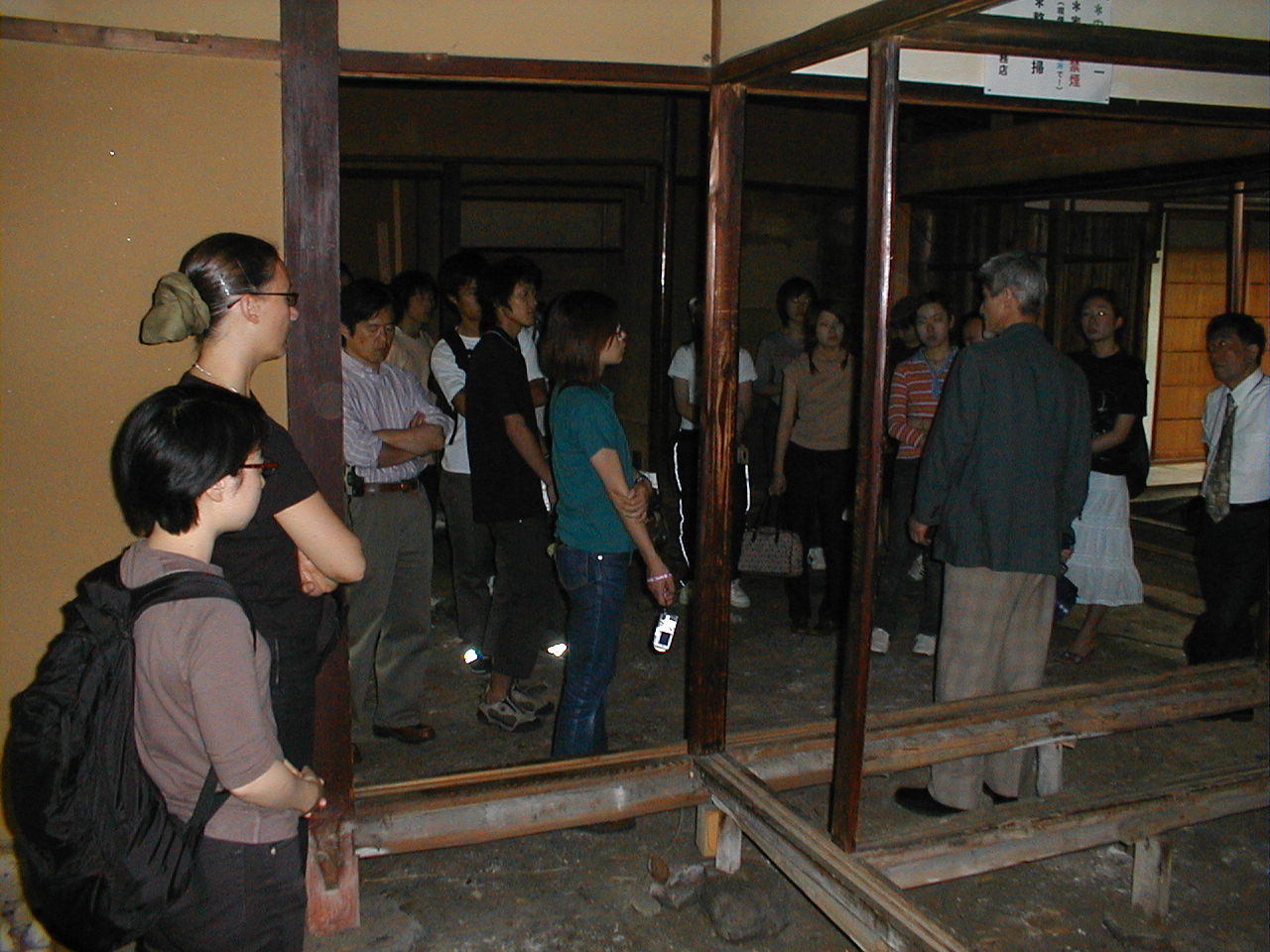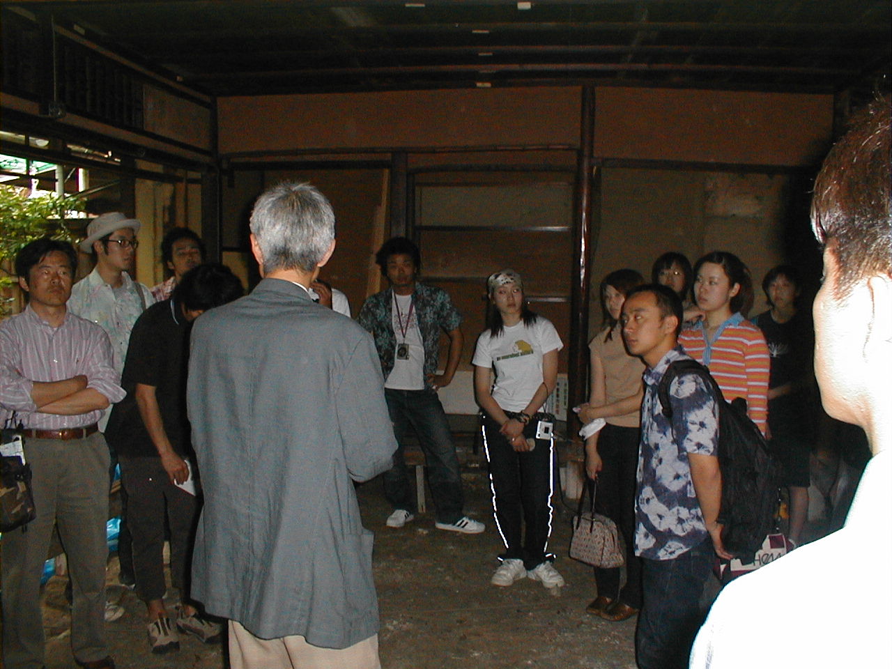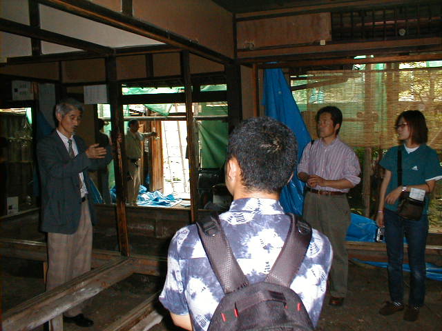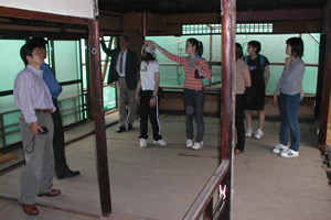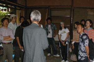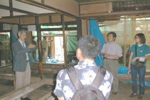 府立大・大場先生の授業の課題、田中邸をモデルにした町家改修設計のための現場見学で、前に田中邸と建田邸の見学をしており、3回目の実地授業であり、作事組改修ケースN邸の見学が6月4日 1時より、行われました。丁度内部解体が終わり、いよいよ本格的に工事着工前の静けさの中、梶山理事長の「町家」の構造から成り立ちを目を輝かせながら聞き入り、傾斜している柱(南と西へ90ミリ)や、60ミリ前後起伏している床を見て「直るのですか?」の質問に「直る!」との即答に不思議な顔をしてたのが印象的でした。逆質問で、「町家のどこがいい?」との問いに、「雰囲気」、「デザイン」、「ファサード等」と、ぼんやりとしたアンサーで、町家を五感で感じ取ってもらいましたが、最後に自然井戸に冷やされた「ラムネ」を飲んでいる時が一番輝いていました。 |