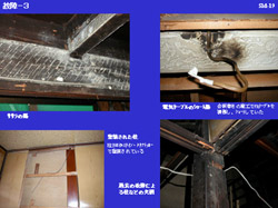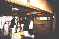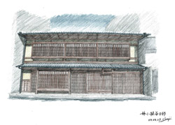 作事組も5年経った今でこそ“なんじゃこれは”と言うことは少なくなったが、これは失敗の積み重ねの賜である。何でそんなことになるかと言えば町家が見向きをされなかった間の改修作法にある。町家は点検や手入れがし易いようにつくられているが、その点では今のつくり方は“今が良ければ後は野となれ山となれ”であり、床、壁、天井に合板類が張り廻してあって、柱や梁の状態が見られない、オモテの木部は大方ペンキが塗られているという状態で、それらをめくったり剥がすと柱や梁がシロアリにやられていて、取り替えや根継ぎが必要になる。あるいは何ともなく見えた木部はペンキ薄皮一枚で中は跡形もないということになっていたりする。直し手の一方的な言い分ではたとえ崩れかかっていて、まさに自然に帰ろうとしている状態でも放置されてきた方が確認もでき手入れもし易くてありがたいと言うことになる。まさか全部めくってしまってから“こんな状態でこれだけかかるがどうしましょうか”というわけには行かないので調査時に復旧が可能な範囲で部分的にめくってみて経験則で全体の状態を推し量ることになる。 事前調査は設計者や大工だけではなく各職参加で行い、施主も立ち会って確認することが大切である。 §設計作法 そもそも町家は間取りに番付(通り符号)を記し屋根のかけ方や床やタナなどの装置を板に描き込んだ板図と、平面割りと高さ割りを角棒に刻んだ尺杖だけで建てられてきた。今、見積りや図面で仕事をする機会が多くなった職人の便宜のために必要とは言え、設計図は必要最小限にとどめるべきである。理由のひとつは改修の場合は現物がそこにあるからであり、ふたつには現場で設計図が制度の役割をしてしまって、職方の自律的なもの作りの情熱をそいでしまったり、創意・工夫を妨げることがないようにするためである。