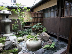 前栽の植栽は広さに応じたものにする。新たに作る場合は、樹木が定着し成長を始める5年先の姿を想定し、植えすぎないようにする。植栽は植えたら終わりではなく、特に町家の庭は狭いため、一定の大きさで姿形を整え、そのまま維持し続けることになり、継続的な手入れが必要である。手入れも考えて適切な規模にすることが大切である。池泉は維持が難しく、水は手水(ちょうず)にとどめた方がよい。今見られる町家の庭の景石や踏み石あるいは灯籠や手水は、庭のスケールをはみ出して大きいことが多い。できるだけ押さえ気味にした方がよい。また排水は配管に頼ると、トラブルが多く、自然浸透と吸い込みを基本にする。 中庭は常緑で大きくならず、日照が不足しても育つ草木と下草程度。ゲンカンニワは手入れの便宜上鉢植え程度が良い。オモテはロージ奥であれば似合うが通りには似合わない。 |