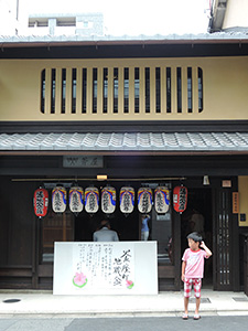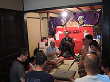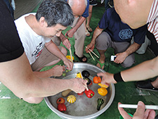 その後は少し変わった企画がありました。子供さんの数より大人のほうが多いこともあって、子供も大人も楽しめるようにと役員さん方が考案した金魚すくいならぬ野菜すくいです。賀茂なすや鹿ケ谷かぼちゃ、すずかぼちゃからバターナッツ南瓜まで、大きいのや小さいの、色んなかたちのお野菜を水に浮かべて菜箸で掬うというもの。変り種のお野菜はお盆のお供えものとばかり思っていたのですが、水に浮かべて掬った野菜が収穫物となり、家庭のお昼ごはんになるというのです。見事な手わざを発揮された釜師の奥様もおられて、古くから栄えた鋳物師の座という土地柄のすばらしい一端を垣間見た気がいたしました。 子供たちだけでは少し難しそうだった西瓜割りも、お祖父さんにくっついてぐるぐる回り、ふらつきながらもようやく西瓜に的中し、大へん盛り上がったところで正午となり、午前の行事は終了しました。作事組相談会の当番のために来ていただいていた荒木棟梁とご一緒に美味しい西瓜をご馳走になりました。 午後3時、後片付けの時間まで何とか天気は持ちこたえたものの、夕方、府庁近くのお料理屋ちりりに場所を移した懇親会は雨の中でした。風雨で不安な夜を過ごされている方々に思いを馳せつつ、今年も町内の皆様と無事に地蔵盆の行事を終えることができたことに感謝し、解散となりました。 (作事組事務局 森 珠恵)