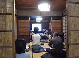 今月の座学は、町家の法的位置付け(建築基準法、消防法、他)、発展しつつある構造計算と町家の関係について学び、話し合いました。特に町家を含む伝統建築の地震に対する構えについては、近年様々な場で議論が行われ、建築基準法による構造計算法に町家を位置づける努力が続けられていますが、未だ不十分な点が多いと思われます。無理に当てはめることで、逆に不都合を生じることも考えられます。伝統建築が長い時間を書けて培ってきた経験と実績を、どのように公的に受け入れることができるかが、町家の維持、保全、再生の大きな課題となっています。「町家が守れ、建てられるようにする市民の会合」は地域から、「作事組全国協議会」は全国各地での活動を糾合しつつ、その課題に取り組んでいます。