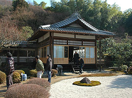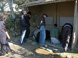 講師:荒木正亘氏 1月17日の棟梁塾ではお茶室の見学会を行いました。荒木塾長に、お手入れされている二つのお茶室を案内いただき、お話を伺いました。関西セミナーハウスの清心庵は杉皮と錆壁の好まれる近代の茶室で数奇屋の一部に近い建物、茶席よりも水屋のほうが砕けた印象です。同じ建物の中の能舞台も見学させていただけました。NHKの洛風荘の幽玄庵は二帖台目の古典的な茶室、先の座学で学んだ窓の数や力貫の架構などを実物に学ぶ良い機会となりました。伝統建築としての茶室に触れた後に、実際の茶の湯とお茶会を学ぶ授業に向います。