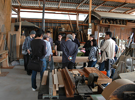 16日の座学では作事組の会員である三加和材木店を見学に訪ねました。松尾社長、山内副理事長から汎用材から銘木まで、古材から世界中から集まった材料までの説明を受けました。荒木塾長からは製材の方法や乾燥方法、末と元の見分け方などの話がありました。 |