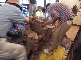 7月の棟梁塾ではまず特別実習で「オクド」の製作に取り組みました。4日の日曜日に清滝のギャラリーテラで塾生が耐火煉瓦を積んでいきました。左官担当理事の萩野親方から解説と指導があり、レンガの規格寸法に合わせて最小限の納まり高さがあり、全体でどう割り振るか、金物の納め方や、弱点になりやすい箇所の補強のなども教わりました。