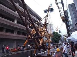 11日の実習では実際の鉾建ての見学、新調された鶏鉾の真木や、一期塾生も加わる船鉾や長刀鉾の組み立ての様子も見学させていただきました。13日からの鉾建てに加わる作事組の若手大工の参加もありました。釜座町家の改修現場の見学も行なわれました。