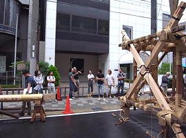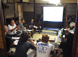 7日の座学では特論での「祇園祭の山鉾の構造」、この5年間京町家再生研究会で取り組んできた大型の山鉾の構造体の実測調査で見えてきた鉾の構造と改修業務の実務の内容について設計担当理事の末川が話をしました。軸組と縄がらみで鉾の構造を一体化し、筋交いの効く方向を前後左右で使い分け、真木の支持をカムロ柱と燧で大きく変形させながらも安定させる仕組みの紹介がありました。