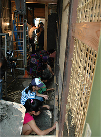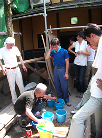 夏休みの8月1日に、塾生は釜座町家の改修現場の見学体験会の木舞掻き、荒壁付けに加わりました。これからご近所の子ども達とご一緒に現場の作業に加わり、お母さん方からはアイスキャンディーを振舞っていただきました。 |